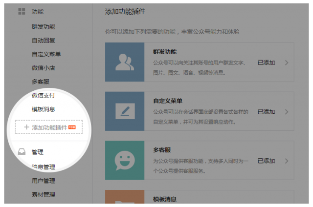 每個公眾號都可以在添加功能插件頁面,看到該帳號能申請的所有功能。