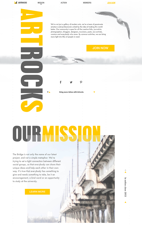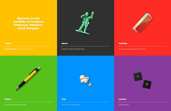 雖說用戶進入你網站之前都知道你企業是做什么的,不過清晰的行為召喚指引依然非常重要,不要以為用戶是你肚子里的蛔蟲,你往往需要通過指引來引導他們你所希望的事情,較為常見的的行為召喚方式是按鈕,填寫表單,引導說明(比如“滾動以查看更多”),甚至動畫。:Jonathan Patterson 的著陸頁中,每個明亮的色塊都會在光標懸停的時候變暗,并且予以說明,引導用戶去點擊獲取更多信息。