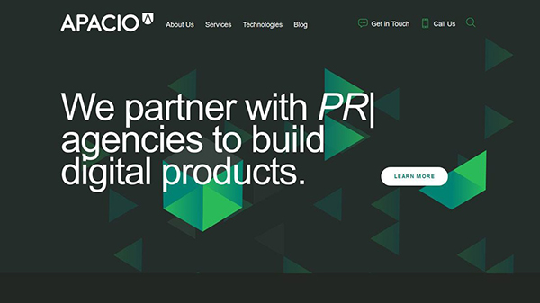 好的設計就應該緊隨時代的發(fā)展,這樣才能具有富有時代感的體驗,背景紋理設計同樣如此。當下,最流行的設計元素之一就是幾何圖形元素,將幾何圖形融入到背景當中,毫無疑問非常具有吸引力,如:Apacio這個網(wǎng)站,它采用深色的背景之上混合色彩鮮艷的幾何圖案,創(chuàng)建出富有深度且抓人眼球的視覺,而文字方面采用了簡約的非襯線體,使得它們可以從黑色和綠色的背景中脫穎而出。