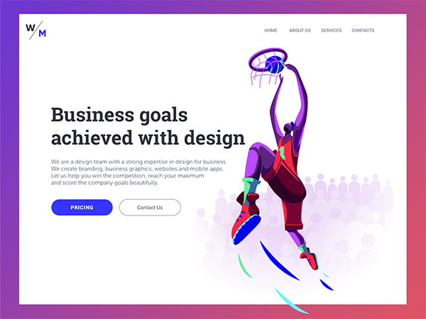 例如:下面的插畫是基于關鍵詞“目標”來進行設計的。籃球運動員灌籃的這一動作和“抵達目標”在寓意上是完美契合的,因此,結合豐富的色彩,通過控制插畫的角度和角色形體,營造出力量感和動感。