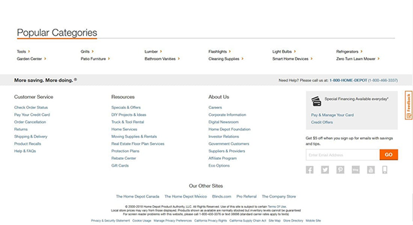 包含大量、不同的內容的網站,應該考慮將大量的鏈接按照類別進行分組管理,通過有組織的鏈接,可幫助用戶找到他們想要的相關的內容。對于大型項目而言,這是一種很常見的技術,對于用戶而言,可能非常有用。以 Amazon為代表的這些在線零售巨頭對于在頁腳中組織信息就有著豐富的經驗,在The Home Depot 的網頁中,頁腳就包含了多層次的頁腳導航。
