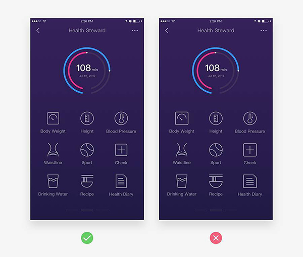 統一的圖標可以提升產品的品質感、信賴感,并且同一屬性的圖標如果保持樣式上的統一可以降低用戶認知成本,提升用戶的使用產品時的效率。由于應用界面設計中,功能圖標不是單獨的個體,都是一系列,但這些組合在一起代表產品的調性,所以具有相同的風格,其中包括造型規則、圓角大小,線框粗細,圖形樣式和個性細節等元素都應該具有統一的規范。