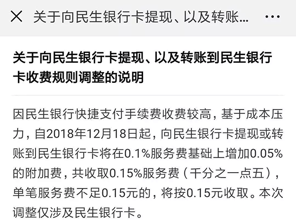 由于民生銀行快捷支付手續(xù)費收費較高,基于成本壓力,從微信零錢提現(xiàn)或轉賬到民生銀行卡需要在服務費0.1%的基礎上,加收0.05%附加費,共收取0.15%服務費(千分之一點五)。單筆服務費不足0.15元的,將按0.15元收取,本次調整僅涉及民生銀行卡,微信支付強調不會以收取提現(xiàn)服務費作為平臺的盈利手段。