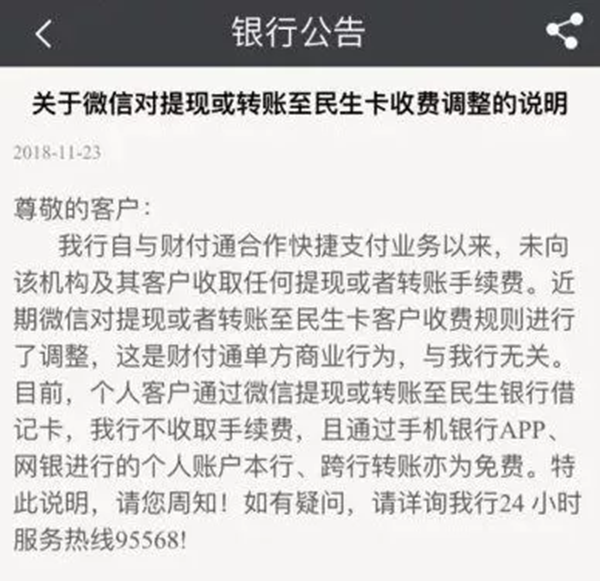 近日微信發(fā)布了一則公告稱:自2018年12月18日開始,民生銀行卡體現(xiàn)和轉賬將在加收0.05%手續(xù)費,對此,民生銀行發(fā)布公告稱:收費為財付通單方面行為,與民生銀行無關……吃瓜群眾表示:和誰有關都不想付啊……