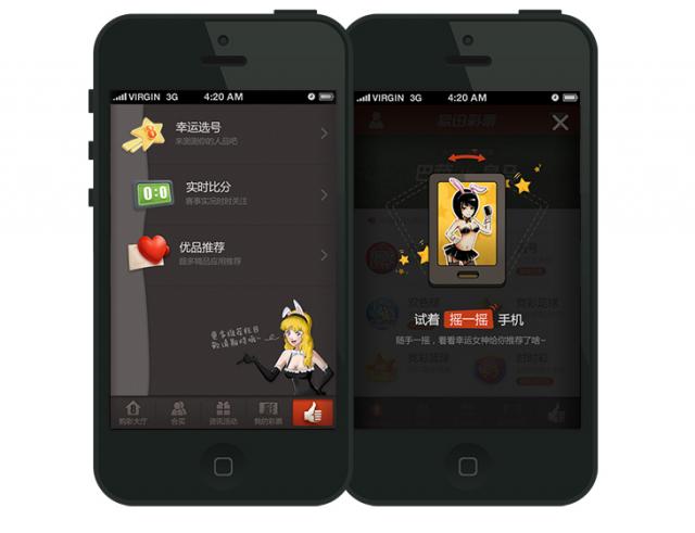 在卡通人物設(shè)計完成后,加入到了APP的推薦功能頁面設(shè)計和搖一搖幸運號頁面設(shè)計中,使頁面增色不少。我們希望通過這一系列的卡通形象包裝,讓易迅彩票APP更有趣的同時更具情感,從而間接的提升了產(chǎn)品的用戶粘性。