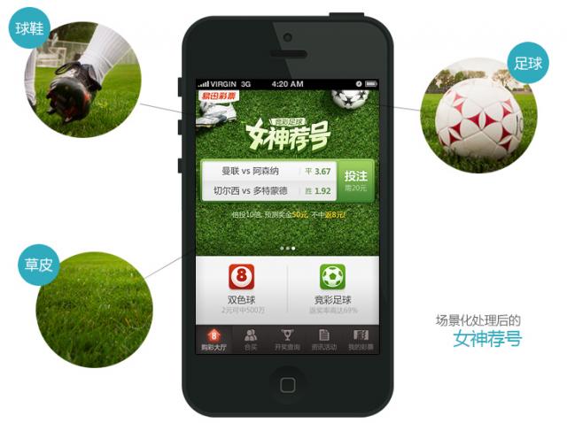 易迅彩票作為趣味化導(dǎo)向的產(chǎn)品,在保證功能簡單好用的前提下,適當(dāng)?shù)募尤雸鼍盎O(shè)計,能夠很好地提升頁面的娛樂性。因為相比于傳統(tǒng)的單純功能性購彩頁面,通過場景化設(shè)計后的頁面更具視覺感染力和使用帶入感。因此我們在競彩足球彩種的女神推薦欄目和購彩頁面嘗試運用了場景化設(shè)計的手法。
