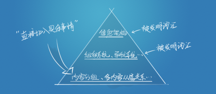 比如在上圖中,信息架構、組織系統、導航系統等都是復合程度較高的詞匯,而它的底層實質上是在做“內容分組”,“分配各個內容的從屬關系”這些具象的事情。